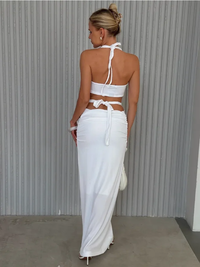 Wholesale Custom High-End Elegant Women's Sexy Resort Set Off-Shoulder Backless Crop Top and Maxi Skirt Short Length Crop Top